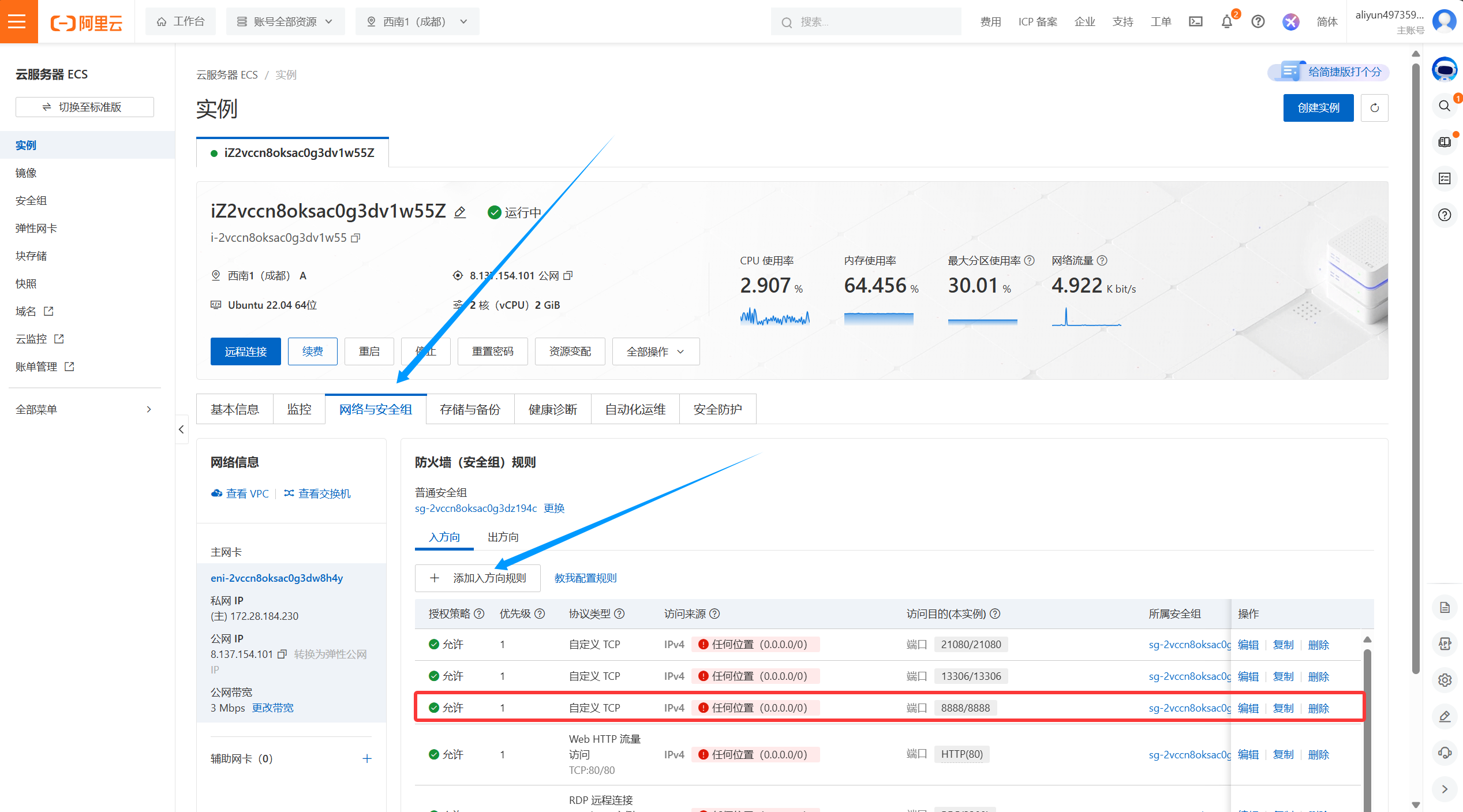 点击网络与安全组,开放8888端口,再次点击链接就可以进入宝塔面板登录界面了