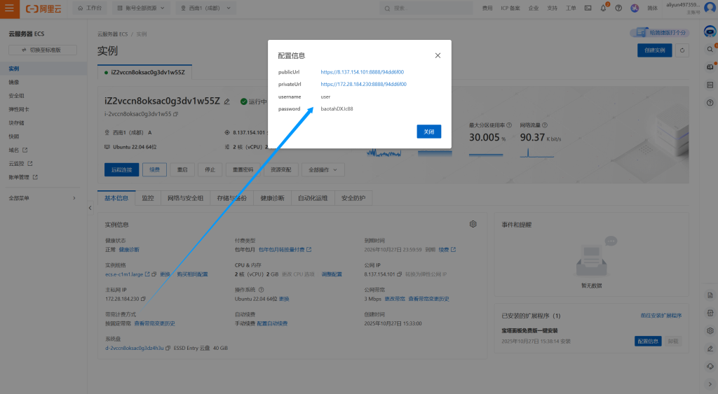 等待阿里云分配实例,进入系统,在阿里云管理界面会有插件安装的提示