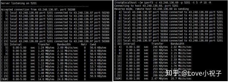 Iperf3介绍 iperf3 是一个 TCP、UDP 和 SCTP 网络带宽测量工具。是用于主动测量 IP 网络上可达到的最大带宽的工具。它支持调整与时序,协议和缓冲区有关的各种参数。对于每个测试,它都会报告测得的吞吐量 / 比特率,损耗和其他参数。 下载地址:iperf3 Iperf3常用参数 -c 以客户端模式运行,连接到服务端 -t 传输时间,默认10秒 -n 传输内容大小,不能与-t同时使用 -b 目标比特率(0表示无限)(UDP默认1Mbit/sec,TCP不受限…